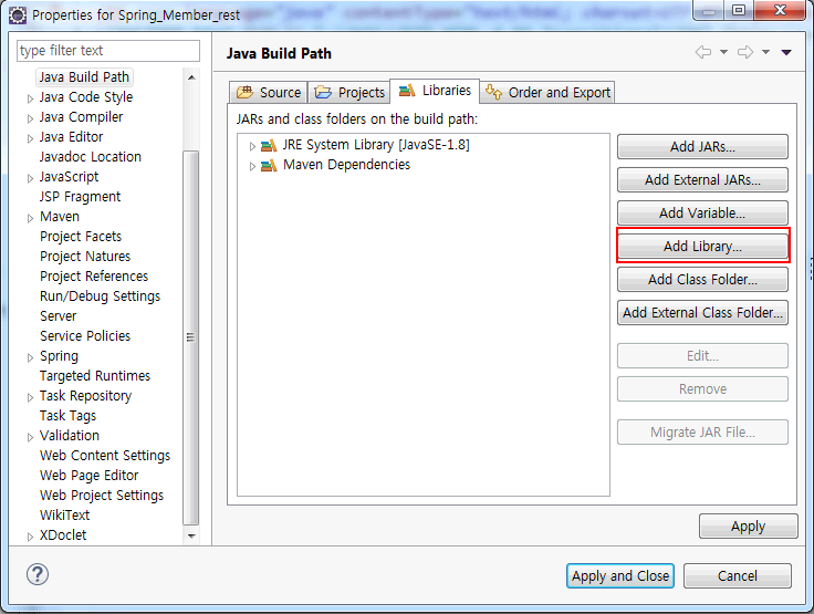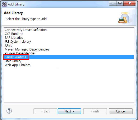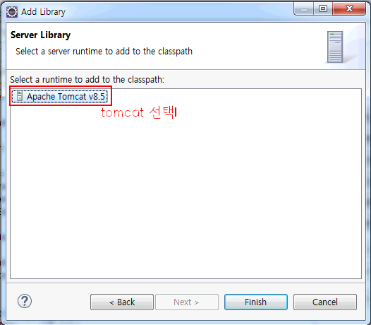 Add Library > Server Runtime > 사용할 tomcat server library 선택