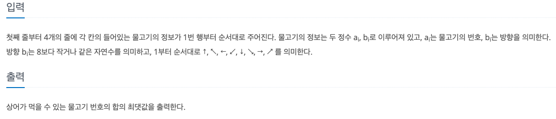 def dfs(r,c,d,sum): #상어 좌표(행,렬), 방향, 먹은 물고기 수