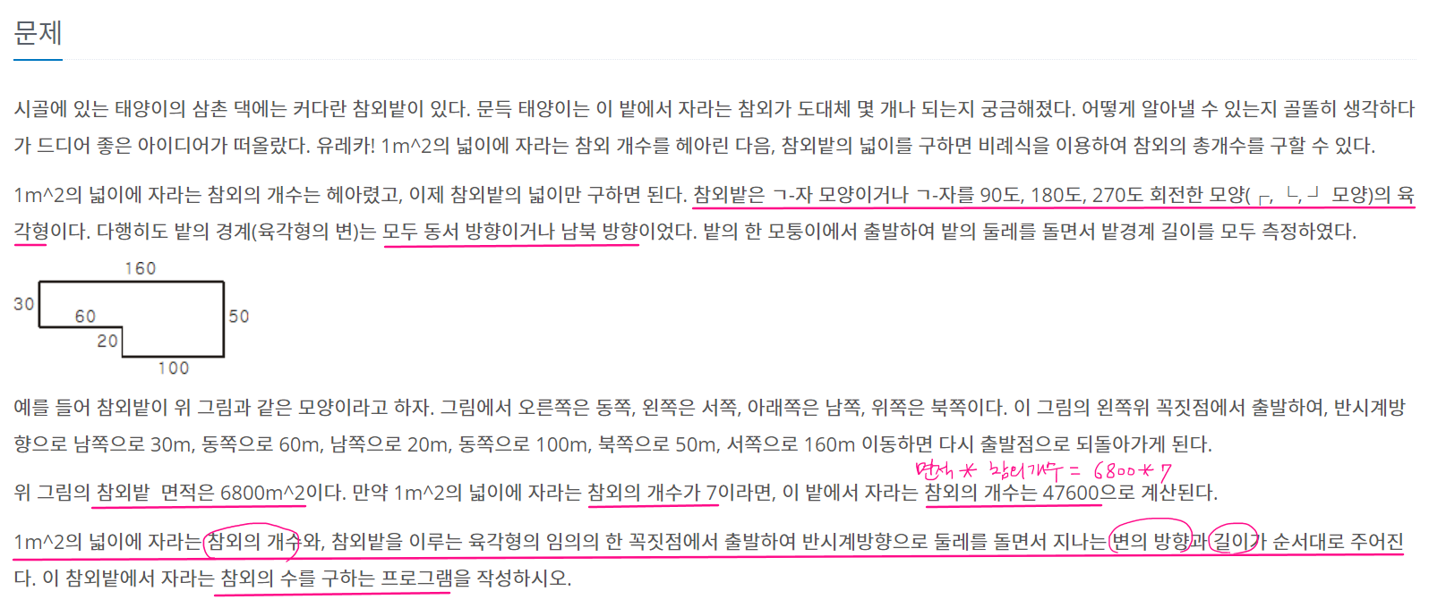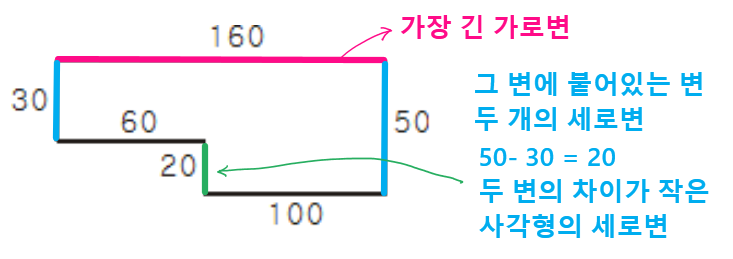 - 주어진 정보를 이용해서 가장 긴 가로변을 구할 수 있음. (위에 큰 사각형의 면적을 구하기 위해서도 필요)