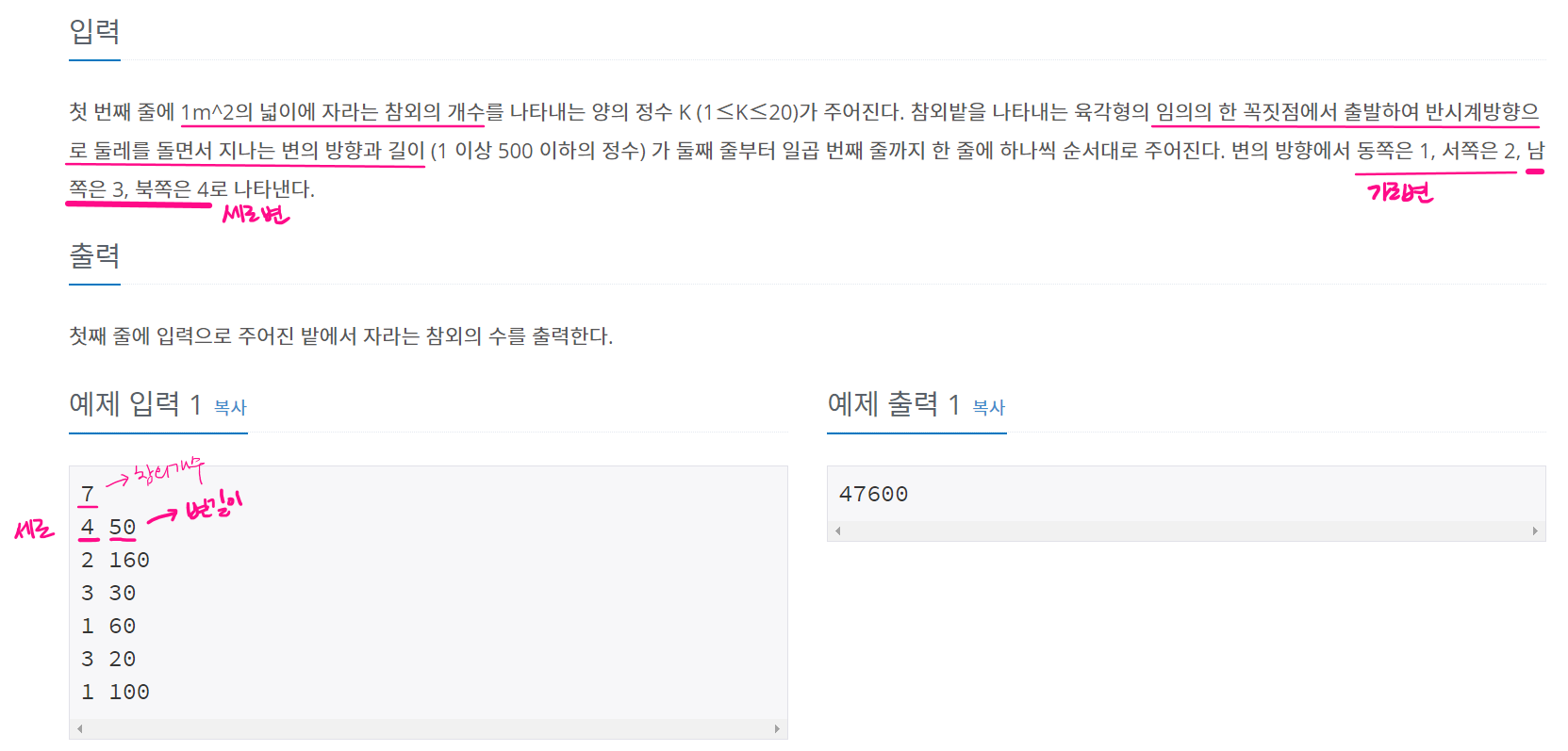첫 번째 줄에 1m^2의 넓이에 자라는 참외의 개수를 나타내는 양의 정수 K (1≤K≤20)가 주어진다. 참외밭을 나타내는 육각형의 임의의 한 꼭짓점에서 출발하여 반시계방향으로 둘레를 돌면서 지나�